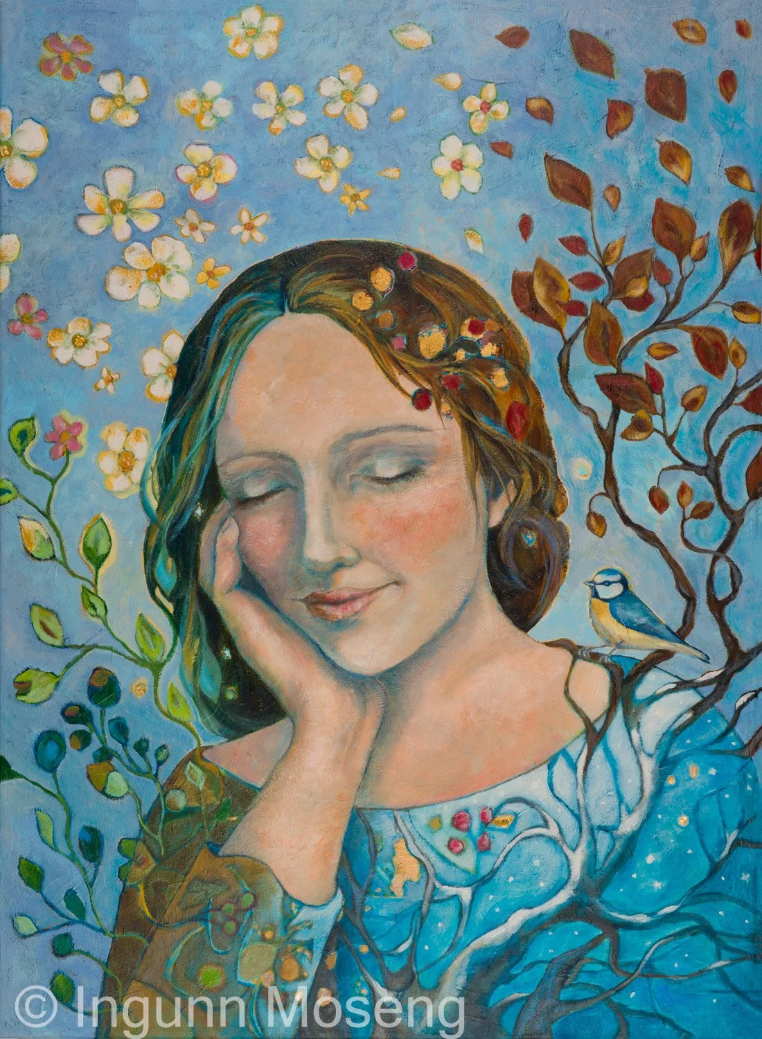 "Blåveis og blåmeis", 50x50 cm acrylic and gold metal leaf on canvas. Prints available for purchase.